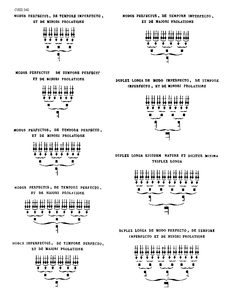 [342] [CSIII:342; text: Modus perfectus, de tempore imperfecto, et de minori prolatione, Modus perfectus, de tempore perfecto, et de minori prolatione, Modus perfectus, de tempore perfecto, et de minori prolatione, Modus perfectus, de tempore perfecto, et de majori prolatione, Modus imperfectus, de tempore perfecto, et de majori prolatione, Modus perfectus, de tempore imperfecto, et de majori prolatione, Duplex longa de modo imperfecto, de tempore imperfecto, et de minori prolatione, Duplex longa ejusdem nature et dicitur minima triplex longa, Duplex longa de modo perfecto, de tempore imperfecto et de minori prolatione] [ANO1DEM 02GF]