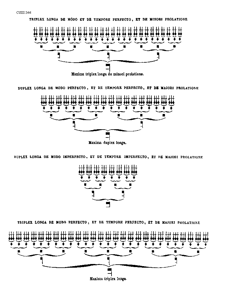 [344] [CSIII:344; text: Triplex longa de modo et de tempore perfecto, et de minori prolatione, Maxima triplex longa de minori prolatione. Duplex longa de modo perfecto, et de tempore perfecto, et de majori prolatione, Maxima duplex longa. Duplex longa de modo imperfecto, et de tempore imperfecto, et de majori prolatione, Triplex longa de modo perfecto, et de tempore perfecto, et de majori prolatione, Maxima triplex longa.] [ANO1DEM 04GF]
