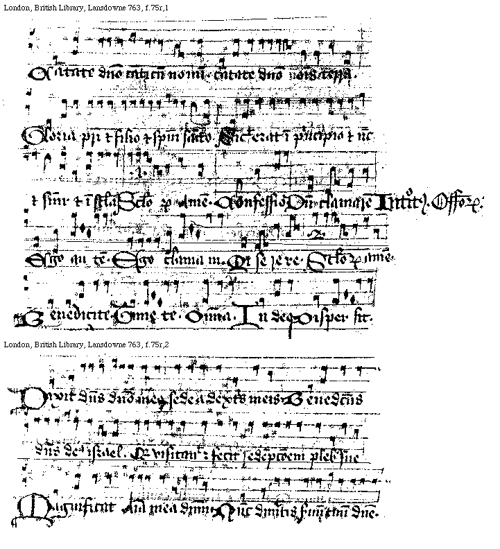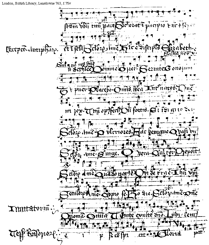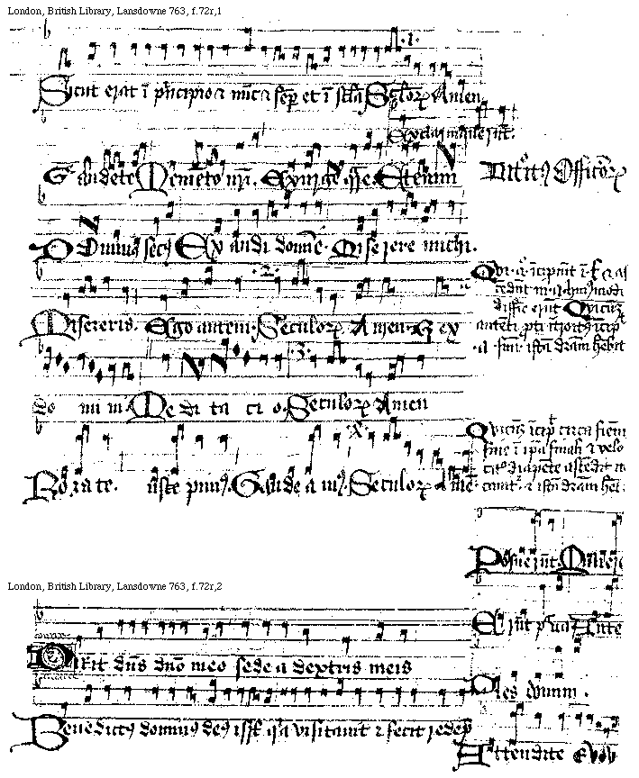 [London, British Library, Lansdowne 763, f.75r,2; text: Dixit dominus domino meo. sede a dextris meis. Benedictus dominus deus Israel. Quia visitauit et fecit redempcionem plebis sue Magnificat Anima mea dominum. Nunc dimittis seruum tuum domine.] [ANODEO 09GF]