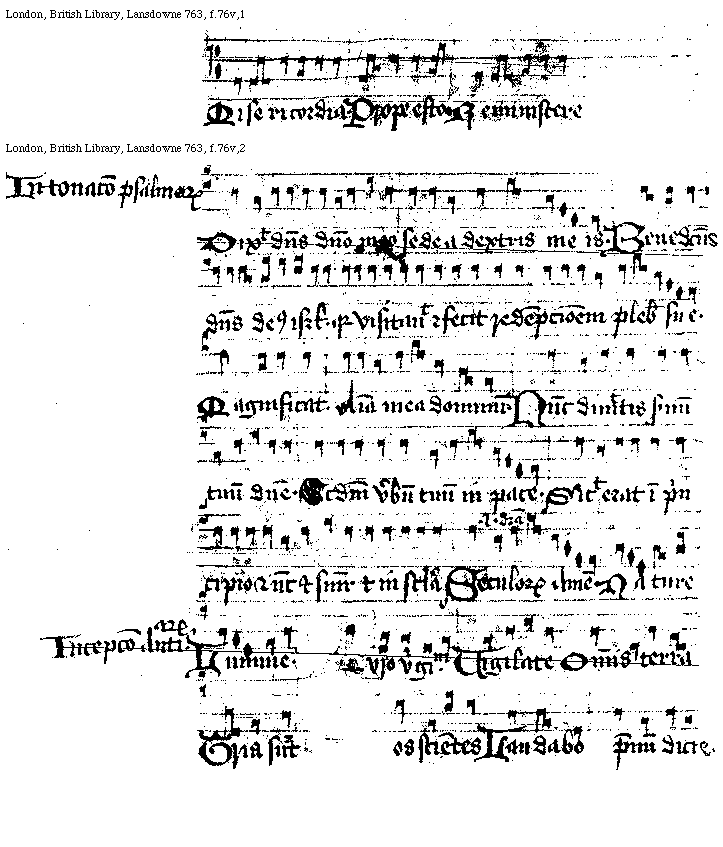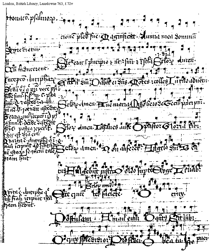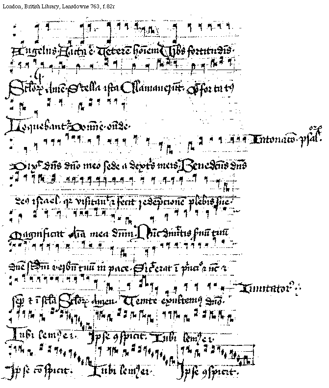 [London, British Library, Lansdowne 763, f.76v,2; text: Intonacio psalmorum, Dixit dominus domino meo sede a dextris meis. Benedictus dominus deus Israel. quia visitauit et fecit recempcionem plebis sue. Magnificat. Anima mea dominum. Nunc dimittis seruum tuum domine. Secundum verbum tuum in pace. Sicut erat in principio et nunc et semper et in secula, Seculorum Amen, prima differencia, Incepcio Antiphonarum. Nature, Lumine. <...>uro virginum. Vigilate, Omnis terra, Tria sunt. <Nos> scientes, Laudabo, <Impnum> dicite.] [ANODEO 12GF]