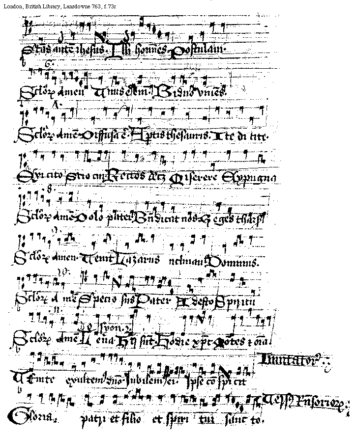 [f.[[72]]73r] [London, British Library, Lansdowne 763, f.73r; text: Stans autem Ihesus. Illi homines. Postulaui. sexta, Seculorum Amen, Vnus est enim. Biduo vniens. septa, Diffusa est. Apertis thesauris. Ite dicite. Exicito, Scio cui. Rectos decet, Miserere, Expugna, octaua, Dolo pater, Benedicat nos, Reges tharsis, nona, Venit, Lazarus, <Inclinauit>, Dominus. decima, Speciosus, Pater, Adesto, Spiritu, vndecima, De Syon .2. Leua, Hij sunt. Hodie Christus, Montes et omnia. Inuitatorium. Venite exultemus domino. Iubilemus ei. Ipse conspicit, Versus Responsoriorum. Gloria patri et filio et spiritui sancto.] [ANODEO 05GF]