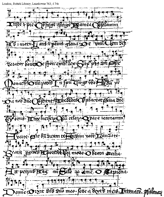 [f.[[73]]74r] [London, British Library, Lansdowne 763, f.74r; text: Iuste et pie. Consurge consurge, Framea, Consolamini, Ab imatu. Laus et perennis gloria, De vnum. Veni desiderator bone. De syon exibit lex. Supra pectus domini, Spiritus, Monachus, Omnipotens, In spiritu, Virgo verbo. Ab hanc pater, Da nobis domine. Constitutus, Accedentes, Complaceat, Sana domine, Totus. Ante Luciferum. Celi celorum. Quare ieiunaminus, Auerte, Sic benedicam te, Audiui vocem. Laudate. Beata progenies, A porta, Vsque modo. O beata Cecilia. Ait Petrus, Aagnum. secunda, Seculorum Amen, O Sapiencia. Domine. Intonacio. Psalmorum, Dixit dominus domino meo. sede a dextris meis.] [ANODEO 07GF]