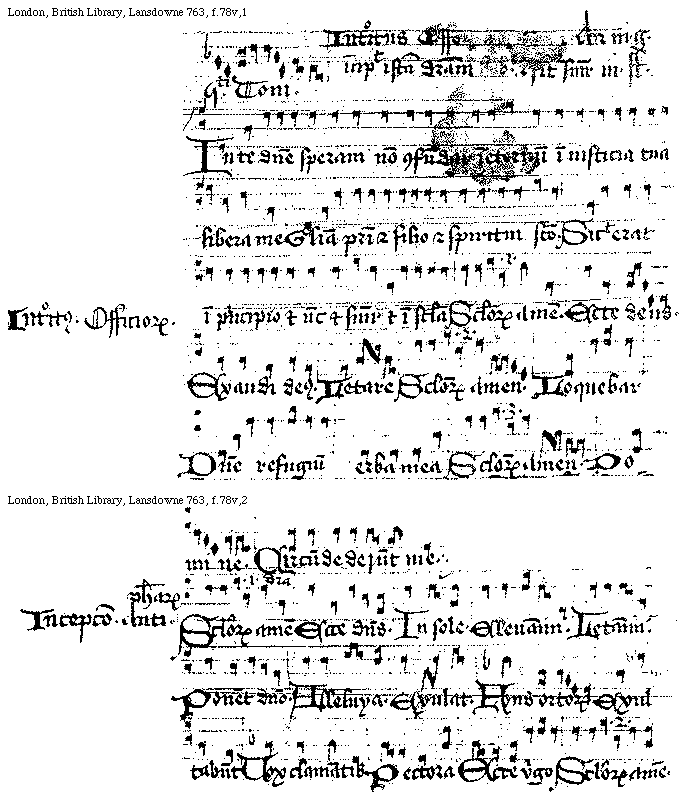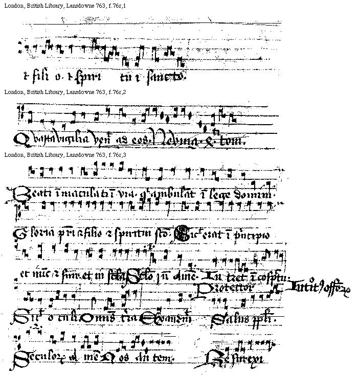 [London, British Library, Lansdowne 763, f.76r,3; text: Beati immaculati in via. qui ambulant in lege domini. Gloria patri et filio et spiritui sancto. Sicut erat in principio et nunc et semper. et in secula Seculorum Amen. prima, Introitus officiorum. [Protector add. sub lin.], Intret in conspectu. Sicut oculi. Omnis terra, Exaudiuit, Salus populi. secunda, Nos autem. Resurexi] [ANODEO 11GF]