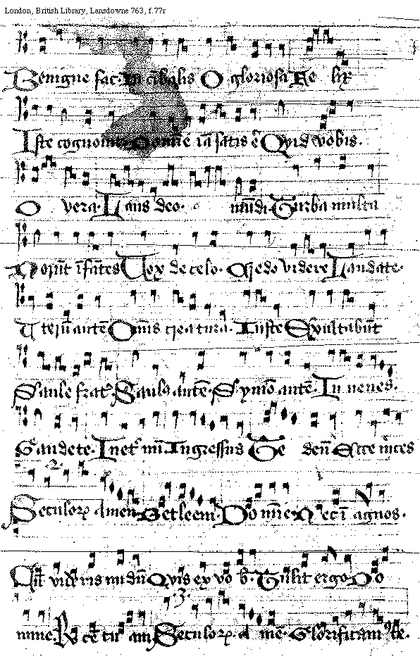 [f.[[76]]77r] [London, British Library, Lansdowne 763, f.77r; text: Benigne fac. In cimbalis, O gloriosa, Felix, Iste cognouit, Domine iam satis est, Quid vobis. O vera. Laud deo. O mundi. Turba multa, Norunt infantes, Vox de celo. Credo videre, Laudate. Vterum autem, Omnis creatura. Iuste, Exultabunt, Saule frater. Saulus autem. Symon autem. Iuuenes. Gaudete. In eternum. Ingressus, Te deum, Ecce merces, secunda, Seculorum Amen. Betleem. Domine, Nec in agnos. Cum videris nudum, Quis ex vobis. Tulit ergo, Domine. Lucem tuam, tercia, Glorificamus te.] [ANODEO 13GF]