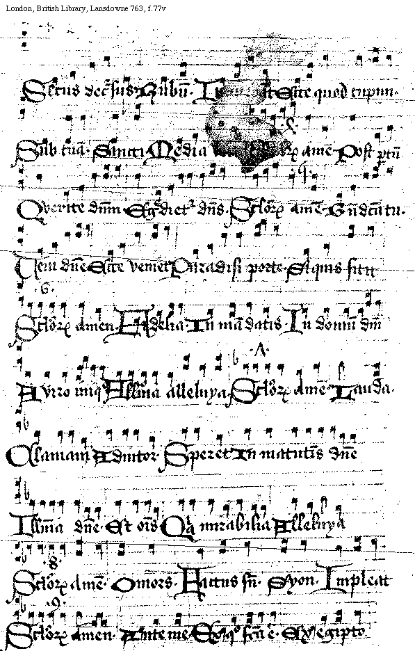 [f.[[76]]77v] [London, British Library, Lansdowne 763, f.77v; text: Secus decursus. Rubum. In<..>ebant, Ecce quod cupiui. Sub tuam. Sancti. Media vita, quarta, Seculorum Amen, Post partum, Querite dominum. Egredietur dominus, quinta, Benedicam tu. Veni domine, Ecce veniet, Paradisi porte. Si quis sitit, sexta, Fidelia. In mandatis. In domum domini, A viro iniquo, Alleluya Alleluya. septima, Lauda. Clamaui. Adiutor. Speret, In matutinis domine, Illumina domine. Et omnis. Quia mirabilia, Alleluya, octaua, O mors. Factus sum. Syon. Impleat, nona, Ante me. Ex quo facta est. Ex Egipto] [ANODEO 14GF]