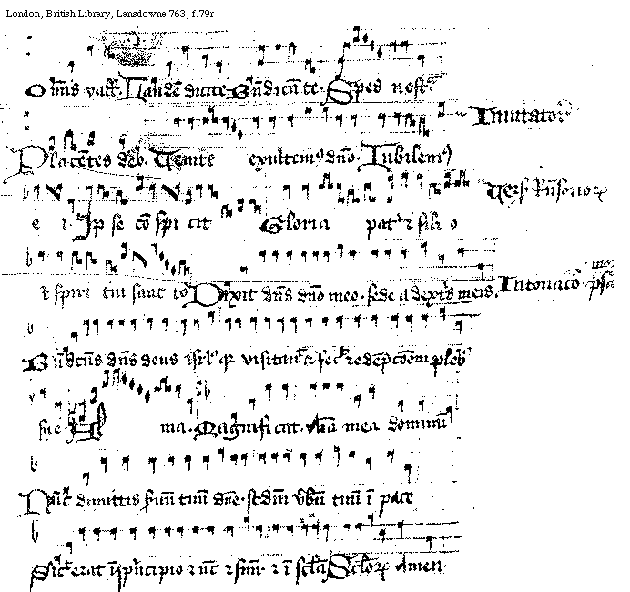 [f.[[78]]79r] [London, British Library, Lansdowne 763, f.79r; text: Omnis vallis. Laudem dicite, Benedicam te. Spes nostra. Placentes deo. Inuitatores, Venite exultemus domino. Iubilemus ei. Ipse conspicit, Versus Responsoriorum, Gloria patri et filio et spiritui sancto, Intonacio psalmorum, Dixit dominus domino meo. sede a dextris meis. Benedictus dominus deus Israel quia visitauit et fecit redemcionem plebis sue. Alma. Magnificat. Anima mea dominum Nunc dimittis seruum tuum domine. secundum verbum tuum in pace Sicut erat in principio et nunc et semper et in secula Seculorum Amen.] [ANODEO 17GF]