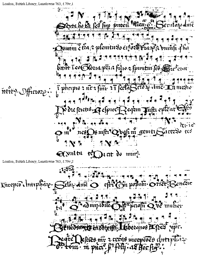 [f.[[78]]79v] [London, British Library, Lansdowne 763, f.79v,1; text: Sexta hora sedit super puteum Neuma sexti toni. Seculorum Amen Domini est terra et plenitudo eius orbis terrarum et vniuersi qui habitant in eo Gloria patri et filo et spiritui sancto. Sicut erat in principio et nunc et semper et in secula Seculorum amen. Introitus. Officiorum. In medio, Hodie scietis. Respice. Requiem, Iusti epulentur, Esto, Omnes, Os iusti, Quasimodo geniti, Sacerdotes, dei et cetera. Exultate, Dicit dominus.] [ANODEO 18GF]