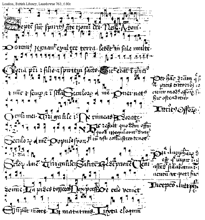 [London, British Library, Lansdowne 763, f.80r; text: Septem sunt spiritus ante tronum dei. Neuma septimi toni. Dominus regnauit exultet terra. Letentur insule multe. Gloria patri et filio et spiritui sancto. Sicut erat in principio et nunc et semper et in secula Seculorum amen. prima, Per hanc differenciam que s<...>am. peritis cantoribus ca<...>citur modus officiorum si<...> hic ostenditur, Introitus Officiorum. Puer natus, Oculi mei. Viri Galilei. Ne timeas, Adorate. Hic restat quoddam officium quod irregulariter dicitur set tamen vsum ecclesiastico tenetur. secunda, Populus syon. Prima Antiphonarum d<...> est que incipit in g <.> ascendit sillabatim in <...> acutam vt patet hic. Incepcio Antiphonarum. prima differencia Seculorum Amen, Viri Galilei, Salutem, Redempcionem, Veni domine. Lapides torrentes, Nox precessit, De celo veniet, Erumpant montes. In matutinis. Iuxta eloquium] [ANODEO 19GF]