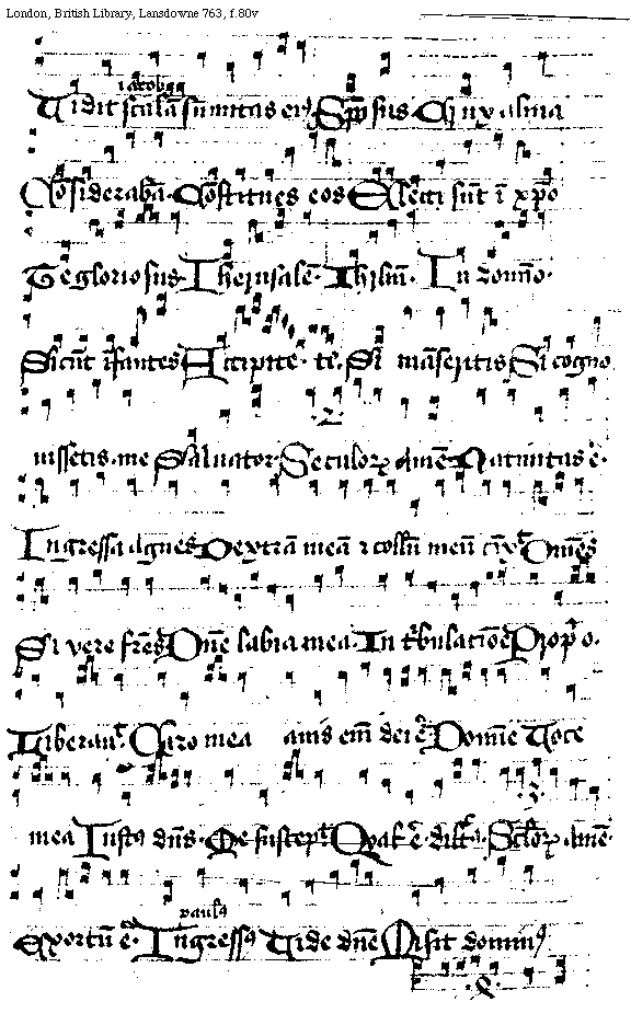 [f.[[79]]80v] [London, British Library, Lansdowne 763, f.80v; text: Vidit [Iacob add. supra lin.] scalam summitas eius. Sponsus, Crux alma, Considerabam. Constitues eos, Electi sunt in Christo, Te gloriosus. Iherusalem. In domino. Sicunt infantes, Accipite. te. Si manseritis, Si cognouissetis. me, Saluator. secunda, Seculorum Amen. Natiuitas est. Ingressa Agnes, Dextram meam et collum meum cinxit, Omnes, Si vere fratres. Domine labia mea. In tribulacione, Proprio. Liberauit. Caro mea, <.>auis enim dei est. Domine, Voce mea, Iustus dominus. Me suscepit. Qualis est dilectus. tercia, Exortum est. Ingressus [Paulus add. supra lin.], Vide domine, Misit dominus, quarta] [ANODEO 20GF]