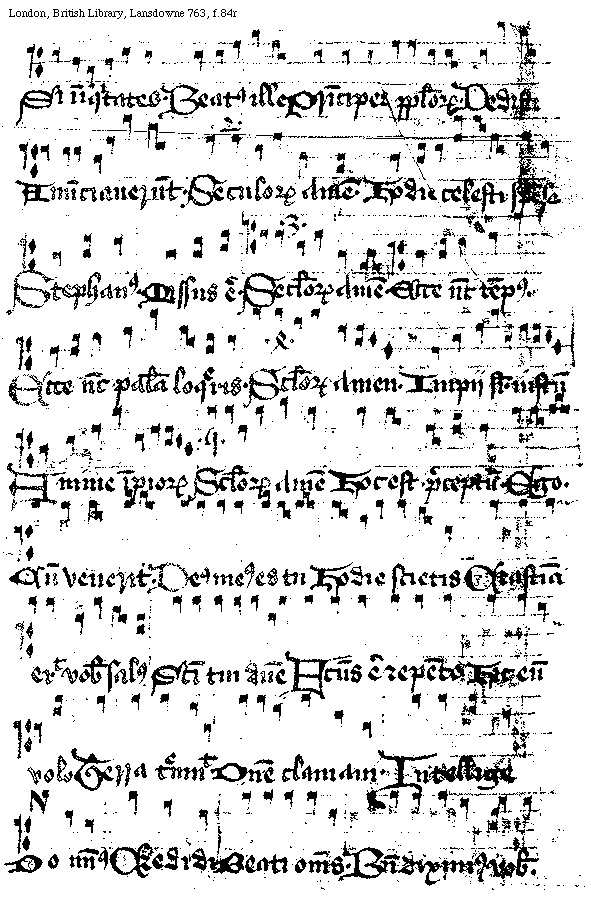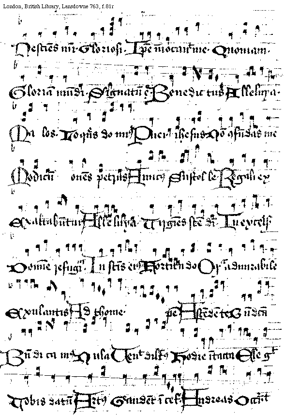 [f.[[80]]81r] [London, British Library, Lansdowne 763, f.81r; text: Nesciens mater, Gloriosi. Ipse inuocauit me. Quoniam. Gloriam mundi. Signatum est. Benedictus. Alleluya. Malos. Loquens dominus, Puer Ihesus. Non confundas me, Modicum, <Ponens> Petrus, Amicus, Sustolle. Regali ex, Exaltabuntur. Alleluya. Virgines sancte dei. In excelsis, Domine refugium. In sanctis eius, Fortitudo, O quam admirabile, Exultantis, Ad thome. <Opem>. Ascendente, Benedicam, Benedicamus, Nula, Venter dilectus, Hodie intactu, Elegit, Vobis datum, Artus, Gaudent in celis. Andreas, Occurrit] [ANODEO 21GF]