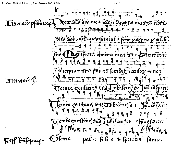 [f.[[80]]81v] [London, British Library, Lansdowne 763, f.81v; text: Intonacio Psalmorum. Dixit dominus domino meo. sede a dextris meis. Benedictus dominus deus Israel. quia visitauit et fecit redempcionem plebis sue. Magnificat. Anima mea dominum. Sicut erat in principo et nunc et semper et in secula Seculorum Amen. Inuitatoria tria. Venite exultemus domino. Iubilemus ei. Ipse conspicit, Venite exultemus domino. Iubilemus ei. Ipse conspicit, Venite exultemus domino. Iubilemus ei. Ipse conspicit. Versus Responsoriorum. Gloria patri et filio et spiritui sancto.] [ANODEO 22GF]