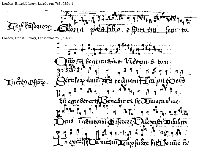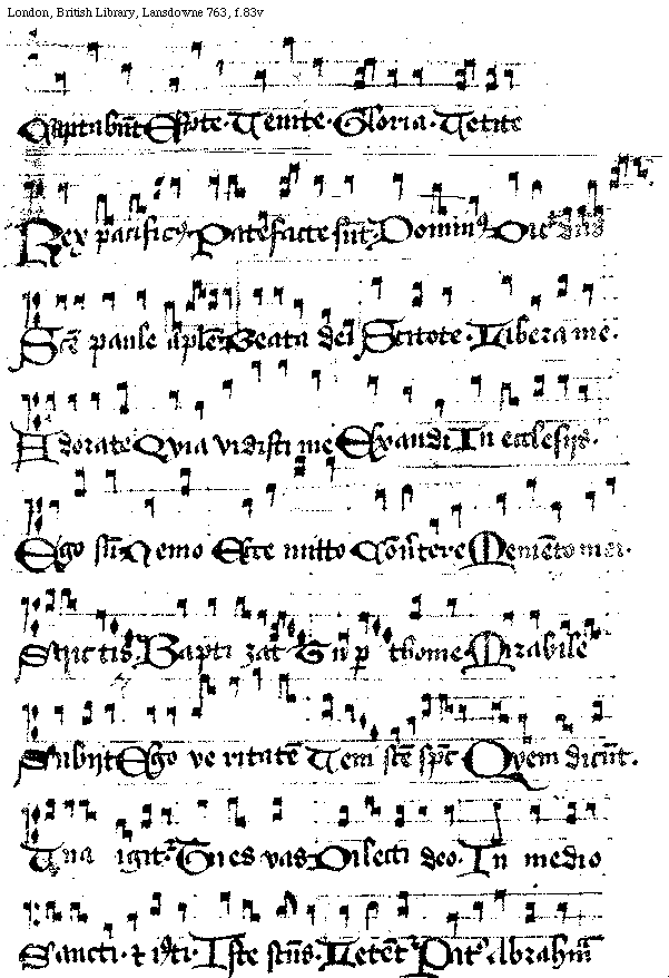 [f.[[82]]83v] [London, British Library, Lansdowne 763, f.83v; text: Captabunt. Estote. Venite. Gloria. Vetite, Rex pacificus. Patefacte sunt. Dominus, Dicit dominus, Sancte paule apostole. Beata dei, Scitote. Libera me. Adorate, Quia vidisti me. Exaudi. In ecclesijs. Ego sum. Nemo, Ecce mitto, Conuertere, Memento mei. Strictis. Baptizat, Tu per thome. Mirabile, Subijt, Ego veritatem, Veni sancte spiritus, Quem dicunt. Vna igitur. Tu es vas, Dilecti deo, In medio, Sancti. et iusti. Iste sanctus. Letentur, Pater Abraham] [ANODEO 26GF]