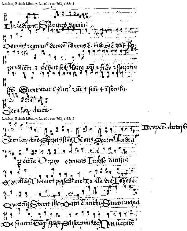 [f.[[82]]83r] [London, British Library, Lansdowne 763, f.83r,1; text: Introduxit. Spiritus domini. Dominus regnauit decorem indutus est, indutus est dominus fortitudinem et precinxit se Gloria patri et filio et spiritui sancto. Sicut erat in principio et nunc et semper et in secula. secunda differencia, Seculorum Amen.] [ANODEO 25GF]