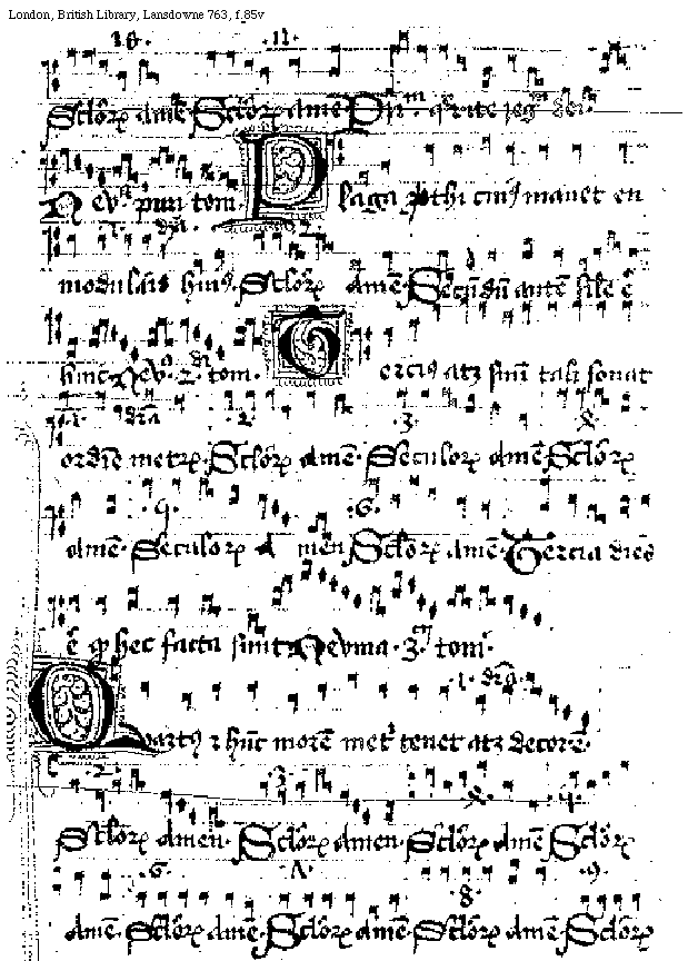 [f.[[84]]85v] [London, British Library, Lansdowne 763, f.85v; text: decima, Seculorum Amen. vndecima, Primum querite regnum dei. Neuma primi toni. Plaga prothi cuius manet en modulacionis huius. prima differencia, secunda, Secundum autem similem est hinc. Neuma secundi toni. Tercius atque suum tali sonat ordinem metrum. tercia, quarta, quinta, sexta, Tercia dies est quod hec facta sunt Neuma tercij toni. Quartus et hunc morem metri tenet atque decorem. septima, octaua, nona] [ANODEO 30GF]