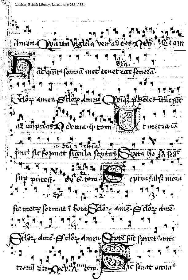 [f.[[85]]86r] [London, British Library, Lansdowne 763, f.86r; text: Amen. Quarta Vigilia venit ad eos. Neuma quarti toni. Hanc quintus formam metri tenet ecce sonoram. prima differencia, secunda, Seculorum Amen, tercia, Quinque prudentes intrauerunt ad nupcias Neuma quinti toni. Vt metra iam primus sic format singula sextus, prima differencia et vltima, Sexta hora sedit super puteum. <Neuma> sexti toni. Septimus absque mora sic metrum format in hora, quarta, quinta, Septem sunt spiritus ante tronum dei. Neuma septimi toni. Sic sonat octauus] [ANODEO 31GF]