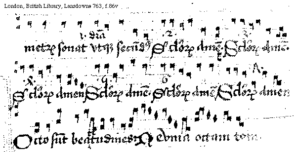 [f.[[85]]86v] [London, British Library, Lansdowne 763, f.86v; text: metrum sonat vtque secundus, prima differencia, secunda, Seculorum Amen. tercia, quarta, quinta, sexta, septima, Octo sunt beatudines [beatitudines corr. supra lin.]. Neuma octaui toni.] [ANODEO 32GF]