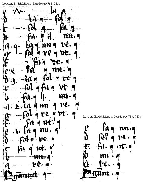 [London, British Library, Lansdowne 763, f.52v; text: [Gamma], gammut, a, b, c, d, e, f, g, 1, 2, 3, 4, 5, 7, re. mi. fa vt. sol re. la mi. sol re vt. la mi re. fa [sqb] mi. sol fa vt. la sol re. sol fa. la sol. la] [ANODESA 01GF]