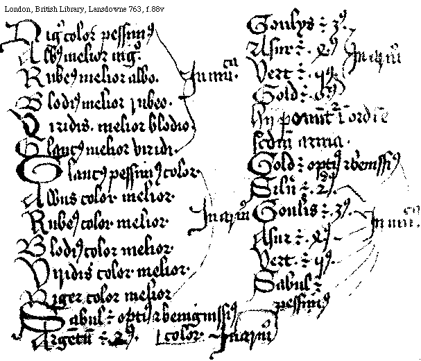[London, British Library, Lansdowne 763, f.88v; text: Niger color pessimus. Albus melior nigro. Rubeus melior albo. Blodius melior rubeo. Viridis. melior blodio. Glaucus melior viridi. In musica. Glaucus pessimus color. Albus color melior. Rubeus color melior. Blodius color melior. Viridis color melior. Niger color melior In armor. Sabul est optimus et benignissimus color. Argentum est secundus. Gonlys est tercius. Asur est quartus. Vert est quintus. Gold est sextus. Hij ponuntur in ordinem secundum arma. Gold est optimus et benissimus, Siluer est secundus. Gonlis est tercius. Asur est quartus. Vert est quintus. Sabul est pessimus] [ANODIST 01GF]