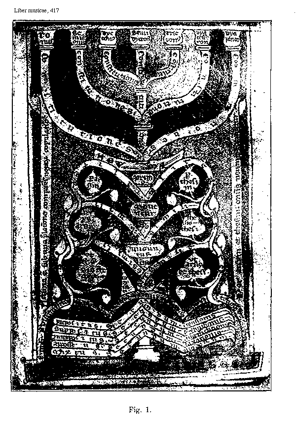 [Liber musicae, 417; text: Figura 1; Tonus, Semitonium, dyctonus, trictonus, dyatesseron, dyapente, constitutiones, NEVMA, primo, secundo, tertio, taliter, per arsim. per thesim. mouentur, similiter, arsys arsy, thesis thesi junguntur, dissimiliter, ut thesis et arsi, ut arsis et thesi. <legi non potest>, Similiter et dissimiliter facta coniunctione motus motui tum erit prepositus secundum intencionis <legi non potest>, Per arsym et thesim. omnis neuma formatur, Neuma est sub una prolatione competens notarum copulatio, prepositus secundum intentionis, suppositus secundum remissionis, interpositus secundum augmentationis, appositus secundum laxationis, mixtus secundum modorum] [ANOLIBM 01GF]