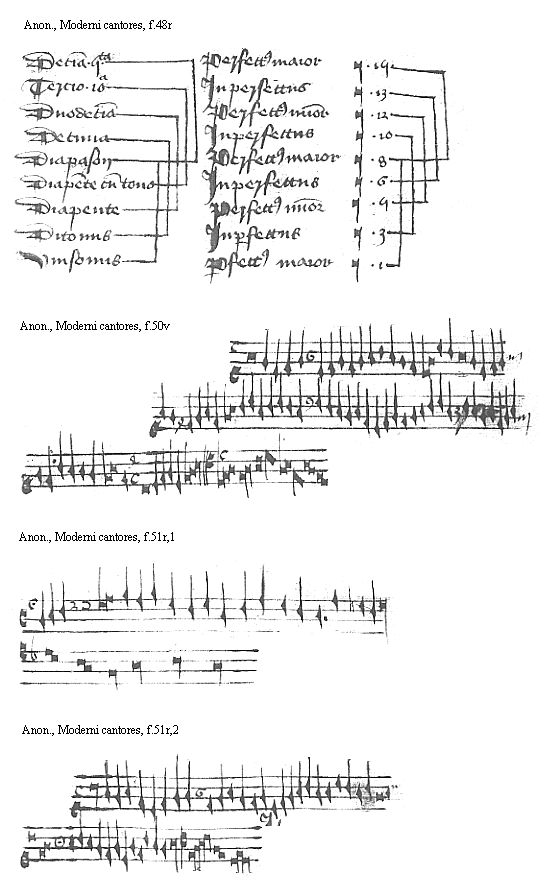 [Anon., Moderni cantores, f.48r; text: Decimaquinta, Terciodecima, Duodecima, Decima, Diapason, Diapente cum tono, Diapente, Ditonus, Unisonus, Perfectus maior, Inperfectus, Perfectus minor, 15, 13, 12, 10, 8, 6, 5, 3, 1.] [BERMAN4 01GF]
