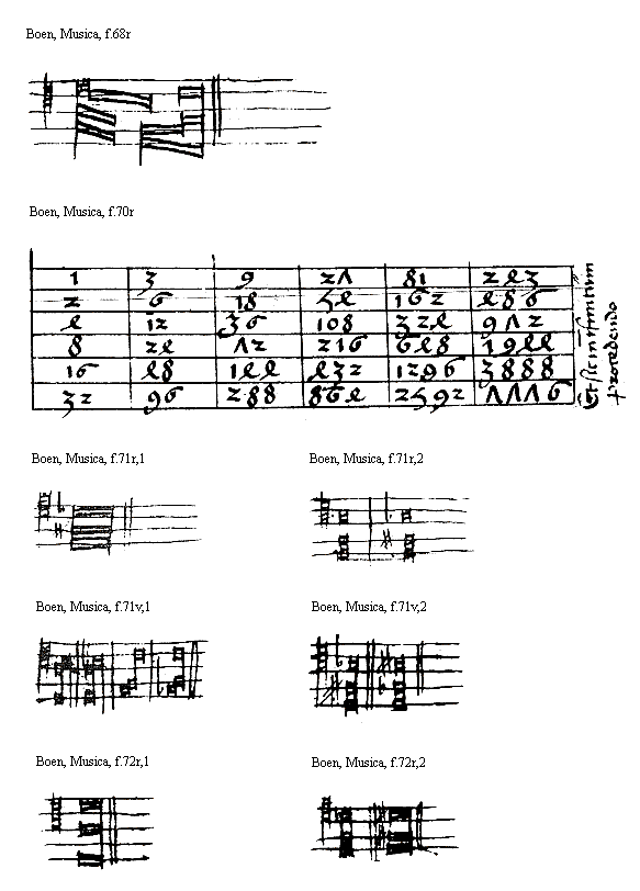 [Boen, Musica, f.70r; text: 1, 3, 9, 27, 81, 243, 2, 6, 18, 54, 162, 486, 4, 12, 36, 108, 324, 972, 8, 24, 72, 216, 648, 1944, 16, 48, 144, 432, 1296, 3888, 32, 96, 288, 864, 2592, 7776, Et sic in infinitum procedendo] [BOENMUSI 03GF]