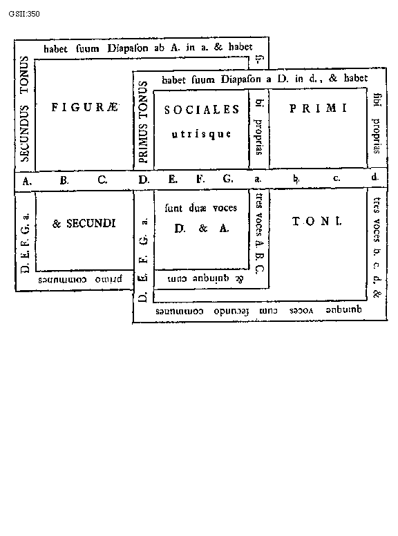 [GSII:350; text: A. B. C. D. E. F. G. a. [sqb]. c. d. FIGURAE PRIMI ET SECUNDI TONI. SOCIALES utrisque sunt duae voces D. et A. PRIMUS TONUS habet suum Diapason a D. in d., et habet sibi proprias tres voces b. c. d. et quinque voces cum secundo communes D. E. F. G. a. SECUNDUS TONUS habet suum Diapason ab A. in a. et habet sibi proprias tres voces A. B. C. et quinque cum primo communes D. E. F. G. a.] [ENGDEM4 01GF]