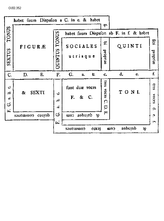 [GSII:352; text: C. D. E. F. G. a. [sqb]. c. d. e. f. FIGURAE QUINTI ET SEXTI TONI. SOCIALES utrisque sunt duae voces F. et C. QUINTUS TONUS habet suum Diapason ab F. in f. et habet sibi proprias tres voces d. e. f. et quinque cum sexto communes F. G. a. [sqb]. c. SEXTUS TONUS habet suum Diapason a C. in c. et habet sibi proprias tres voces C. D. E. et quinque cum quinto communes F. G. a. [sqb]. c.] [ENGDEM4 03GF]