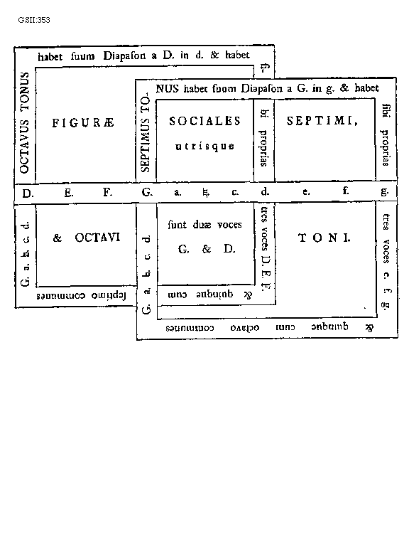 [353] [GSII:353; text: D. E. F. G. a. [sqb]. c. d. e. f. g. FIGURAE SEPTIMI ET OCTAVI TONI. SOCIALES utrisque sunt duae voces G. et D. SEPTIMUS TONUS habet suum Diapason a G. in g. et habet sibi proprias tres voces e. f. g. et quinque cum octavo communes G. a. [sqb]. c. d. OCTAVUS TONUS habet suum Diapason a D. in d. et habet sibi proprias tres voces D. E. F. et quinque cum septimo communes G. a. [sqb]. c. d.] [ENGDEM4 04GF]