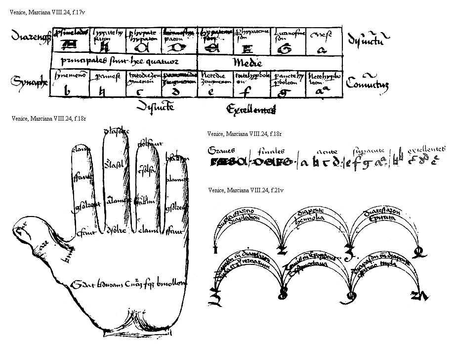 Gamma graues D finales a prebet acutas Et superexcellunt quas inhoat aa duplicata Item octo prime note capitales appellantur Sequentes octo minute vltime vnomodo dicuntur duplicate aliomodo nominantur iste note alteris et vocibus ipsis vel per ipsas designatis Ita semper quod littere proponantur et voces Inmediates subsequuntur quod quomodo contingat Inferius cum de vocibus dicturi sumus liquide apparebit Qualiter autem note predicte ordine distinguantur Iam sepius visum similiter de potestate in quantum sufficit in proposito Sed de posicione siue situ earum de quo est maior vis facienda videamus Inuenitur autem earum posicio in tribus scilicet in monochordo In manu et in libro Vsus monocordi non habetur in vsu communiter Ne tamen quid per nomen dicatur ignoretur Sciendum quod monocordum ut dicit dominus Odo In Dialogo suo Est instrumentum quadratum longum in modum capse intus concauium In modum cythare super quod vna corda in medio posita sonat Cuius sonitu vocum varietates de facili comprehenduntur et dicitur a monosus quod est vnum et chorda quasi vnam habens cordam sicut decachordum decem habet cordas et octochordum octo habet chorda Istud autem instrumentum secundum Iohannem perutile est ad hoc ut per ipsum probetur de omni cantu de quo dubitatur an sit verus vel falsus et vt pueri ad musicam aspirantes ipsius sono duce facilius dirigantur sed quia In vsu non est de modo ipsum componendi [f.18v] et diuidendi qui multi sunt similiter et de composicione notarum in ipso ad presens decreuimus supersedere Si quia autem curiosus indagator existens hoc scire voluerit querat in mucrolog Guidonis vel in dialogo Odonis vel in Summa Iohannis quia hij satis omnis de hoc tractauerunt Deposicione autem harum notarum notum est omnibus quod cottidie in scolis puerorum exercitatur Vt tamen clarius negocium illud elucescat potest hic depingi manus