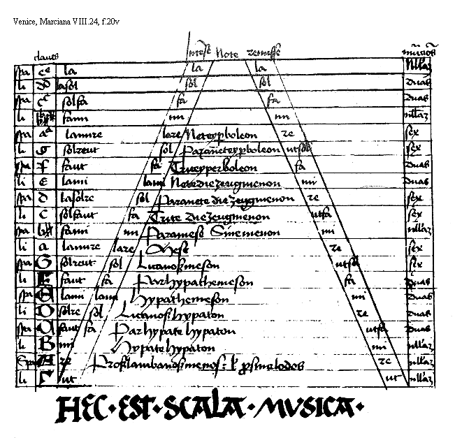 [f.20v] [Venice, Marciana VIII.24, f.20v; text: claues, Intense, Note Remisse, Mutaciones nullam, dua,s sex, Spacia, Linea, ut, re mi, fa, sol, la, [Gamma], A, B, C, D, E, F, G, a, b, c, d, e, f, g, aa, bb, [sqb][sqb], cc, dd, ee, Proslambanosmenos vel prosmelodos, Hypatehypaton, Parhypatehypaton, Licanoshypaton, Hypathemeson, Parhypathemeson, Licanosmeson, Mese, Paramese, Sinemenon, Trite diezeugmenon, Paranete diezeugmenon, Nete diezeugmenon, Triteyperboleon, Paraneteyperboleon, Neteyperboleon, HEC. EST. SCALA. MUSICA. faut, solre, lami, solreut, lamire, fami, solfaut, lasolre, solfa, lasol, lare, utsol, utfa] [HEHESUMM 02GF]