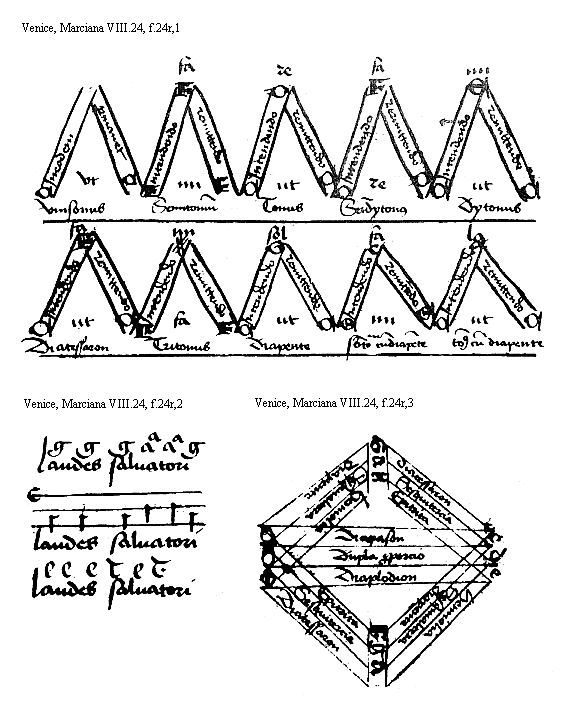 [f.24r] [Venice, Marciana VII.24, f.24, 1; text: vt, ut, re, mi, fa, sol, la, vnisonus, Semitonium, Tonus, Semidytonus, Dytonus, Diatessaron, Tritonus, Diapente, Semitonium cum diapente, Tonus cum diapente, A, B, [sqb], C, D, E, F, G, in eodem, permanet, intendendo, remittendo, Intendendo] [HEHESUMM 03GF]