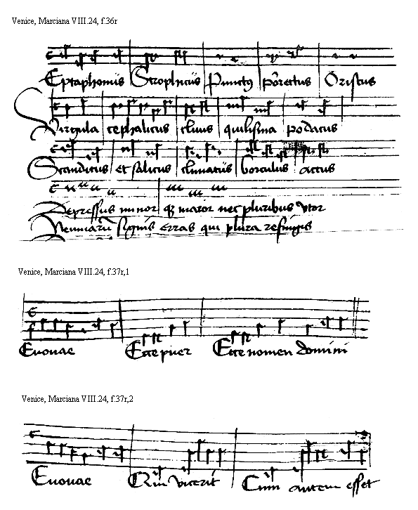 [Venice, Marciana VIII.24, f.43v,1; text: Iste primi toni sonus, Seculorum amen, In, Hec est neuma secundi, In lo<co>, Tercius hic resilit, Cuius, Hoc quartus carmine nostri, Euouae, natum, Sit modulus quinti, Quia, Talis modulacio sexti, Tamquam, Septimus his notulis, Nunccia, Octauus fungitur istis, Descendit] [HEHESUMM 17GF]