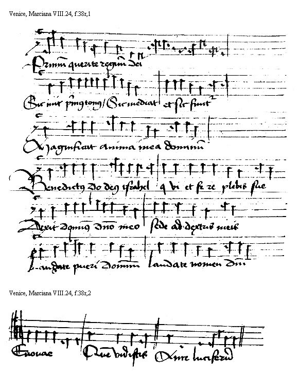 [Venice, Marciana VIII.24, f.38v,3; text: Magnificat anima mea dominum Benedictus dominus deus israhell quia visitavit et fecitt redempcionem plebis sue] [HEHESUMM 08GF]