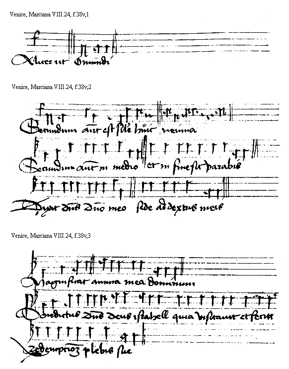 [Venice, Marciana VIII.24, f.38v,2; text: Secundum autem est simile huic, neuma, Secundum autem in medio et in fine sic parabis, Dixit dominus domino meo sede ad dextris meis] [HEHESUMM 08GF]
