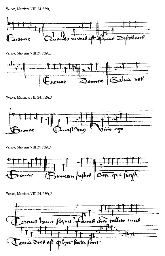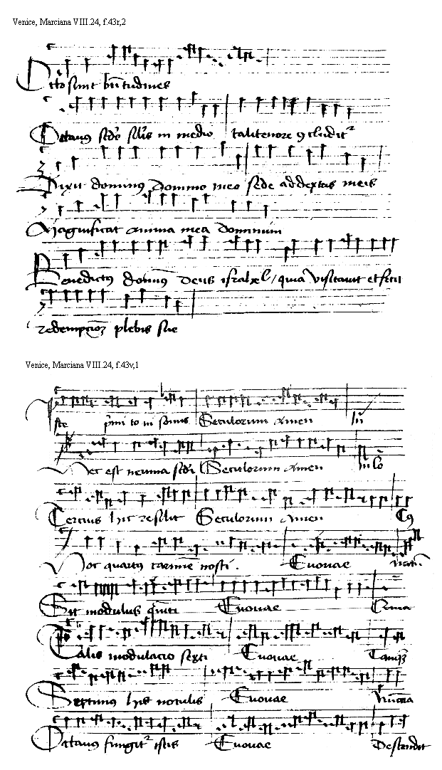 [Venice, Marciana VIII.24, f.41v,2; text: Euouae, Benedictus, Benedixit filijs, Sexta hora sedit super puteum, Sextus tonus sic incipit et sic mediatur et sic finitur, Magnificat anima mea dominum, Eodem modo ceteri psalmi] [HEHESUMM 14GF]