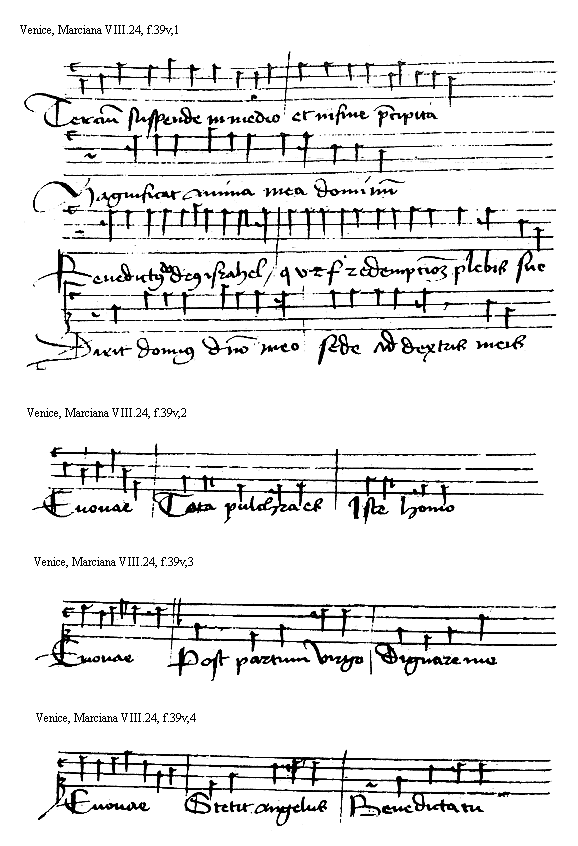 [Venice, Marciana VIII.24, f.39v,2; text: Euouae, Tota pulchra es, Iste homo] [HEHESUMM 10GF]
