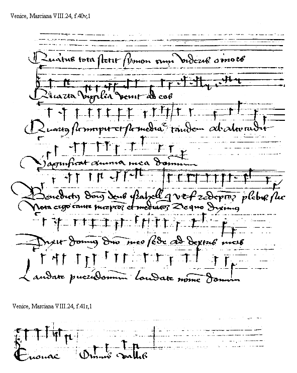[Venice, Marciana VIII.24, f.40v,1; text: Quartus Tota Stetit Symon Cum videris O mors, Quarta vigilia venit ad eos, Quartus sic incipit et sic mediatur tandem ab alto cadit, Magnificat anima mea dominum, Benedictus dominus deus israhell quia visitauit et fecit redempcionem plebis sue, Nota ergo caute incepcionem et mediacionem de quo diximus, Dixit dominus domino meo sede ad dextris meis, Laudate pueri dominum Laudate nomen domini] [HEHESUMM 12GF]