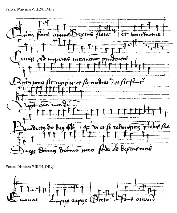 [Venice, Marciana VIII.24, f.41r,2; text: Quintus fons omnis Sextus stetit et benedictus, Cunque ad nupcias intrauerunt prudentes, Quintus sonus sic incipit et sic mediatur et sic finitur, Magnificat anima mea dominum, Benedictus dominus deus israhel quia visitauit et fecit redempcionem plebis sue, Dixit dominus domino meo sede ad dextris meis] [HEHESUMM 13GF]