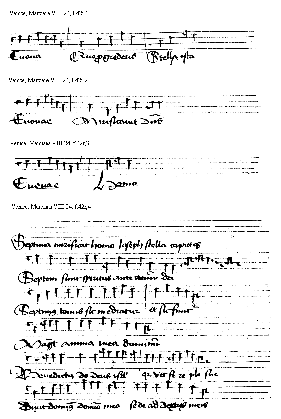[Venice, Marciana VIII.24, f.42r,4; text: Septima mirificat homo Ioseph stella caputque, Septem sunt spiritus ante tronum Dei, Septimus tonus sic mediatur et sic finitur, Magnificat anima mea dominum, Benedictus dominus deus israhel quia visitauit et fecit redempcionem plebis sue, Dixit dominus domino meo sede ad dextris meis] [HEHESUMM 15GF]