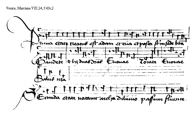 [Venice, Marciana VIII.24, f.43v,2; text: Prima etate creatus est Adam et Eua et positi sunt in sede beata, Gaudete, et habet duas differencias, Euouae, Rorate, Salus nostra, Secunda etate natauit archa diluuio passum fluente] [HEHESUMM 18GF]