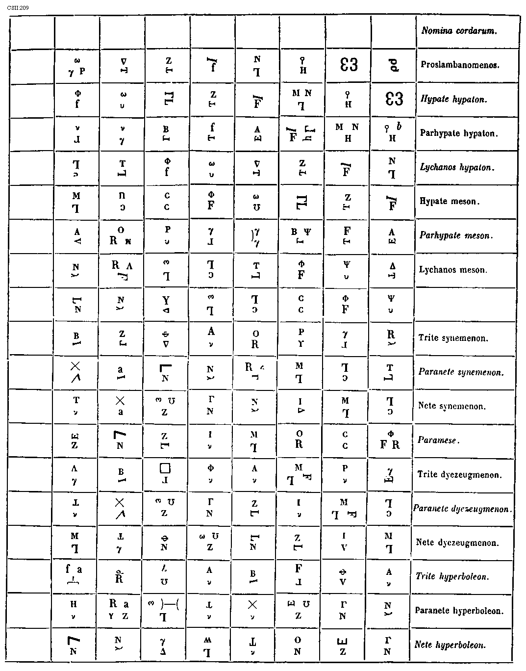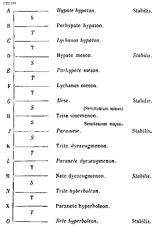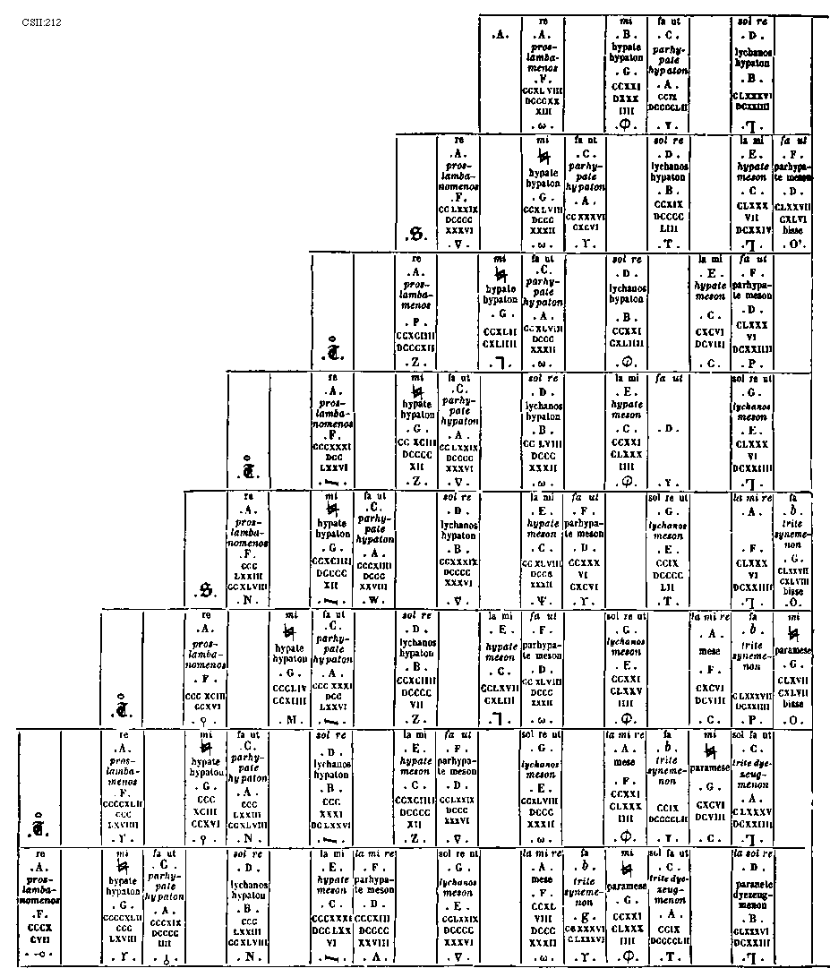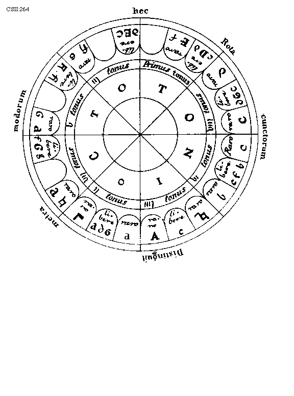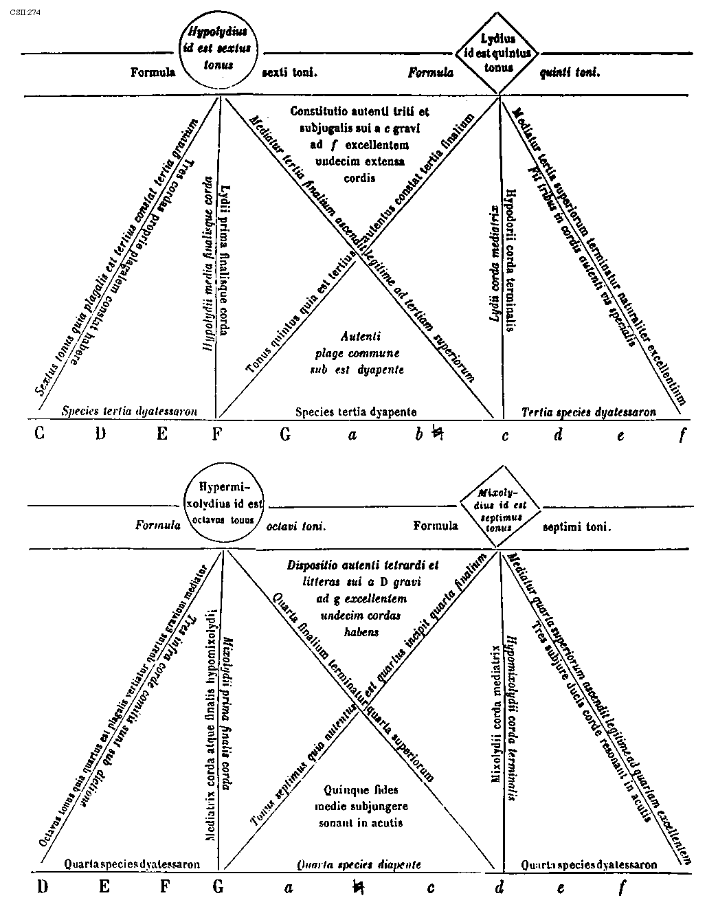 [274] [CSII:274; text: Formula sexti toni. Hypolydius id est sextus tonus, Sextus tonus quia plagalis est tertius constat tertia gravium, Tres cordas proprie plagalem constat habere, Hypolydii media finalisque corda, Fit tribus in cordis autenti vis specialis, Lydii prima finalisque corda, Mediatur tertia finalium ascendit legitime ad tertiam superiorum, Formula quinti toni. Lydius id est quintus tonus, Tonus quintus quia est tertius autentus constat tertia finalium, Mediatur tertia superiorum terminatur naturaliter excellentium, Lydii corda mediatrix, Hypodorii corda terminalis, Constitutio autenti triti et subjugalis sui a c gravi ad f excellentem undecim extensa cordis, Autenti plage commune sub est dyapente, Species tertia dyatessaron, Species tertia dyapente, Tertia species dyatessaron, Formula octavi toni. Hypermixolydius id est octavus tonus, Octavus tonus quia quartus est plagalis vertiatur quartus gravium mediatur, Tres infra corde comitis sunt sub dictione, Mediatrix corda atque finalis hypomixolydii, Mixolydii prima finalis corda, Quarta finalium terminatur quarta superiorum, Formula septimi toni. Mixolydius id est septimus tonus, Tonus septimus quia autentus est quartus incipit quarta finalium, Mixolydii corda mediatrix, Hypomixolydii corda terminalis, Mediatur quarta superiorum ascendit legitime ad quartam excellentem, Tres subjure ducis corde resonant in acutis, Dispositio autenti tetrardi et litteras sui a D gravi ad g excellentem undecim cordas habens, Quinque fides medie subjungere sonant in acutis, Quarta species dyatessaron, Quarta species diapente, Quarta species dyatessaron, C, D, E, F, G, a, b, [sqb], c, d, e, f] [JACSM6A 23GF]