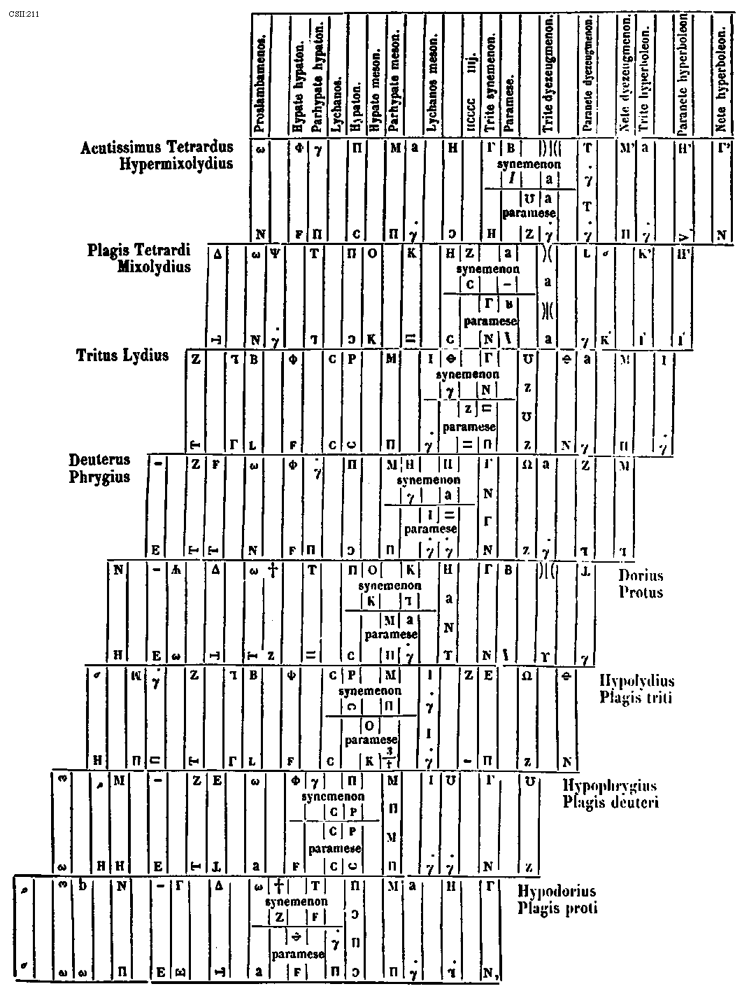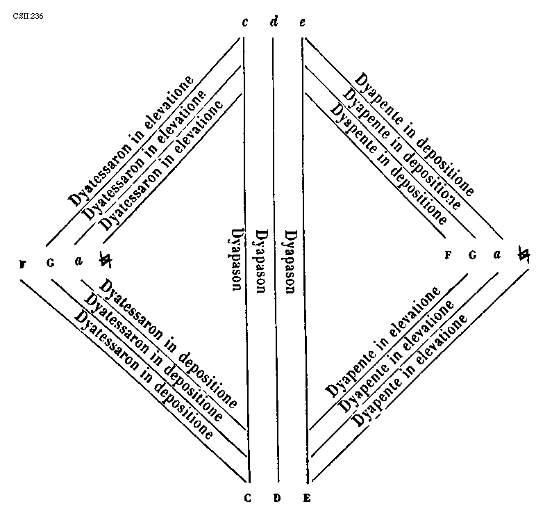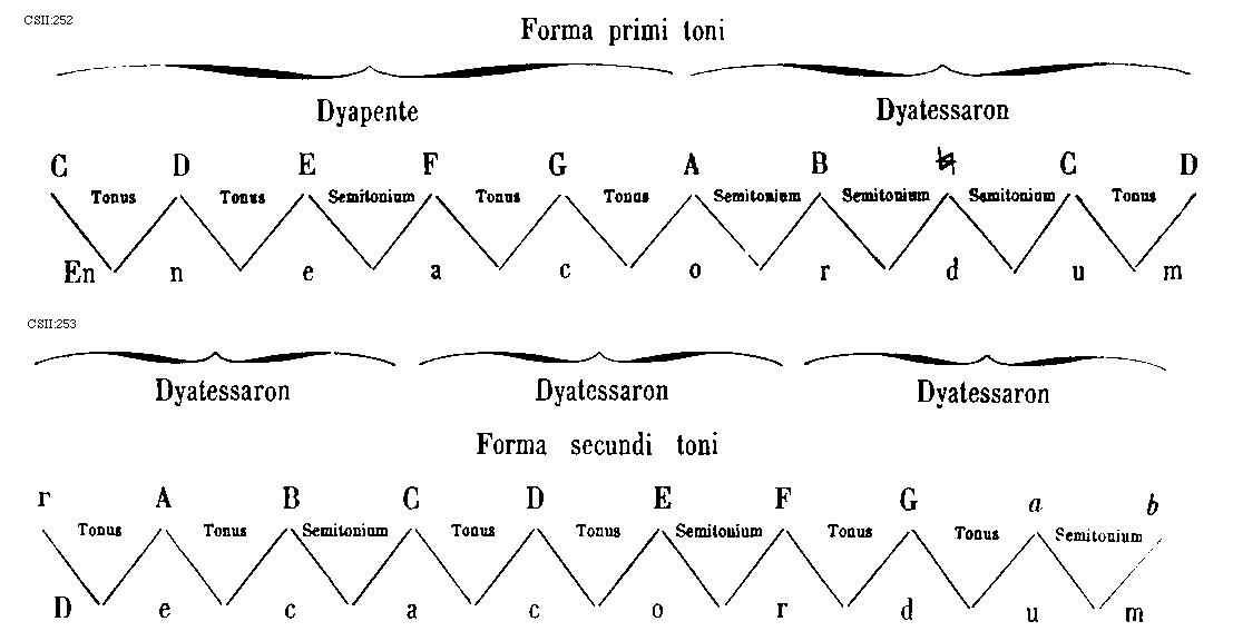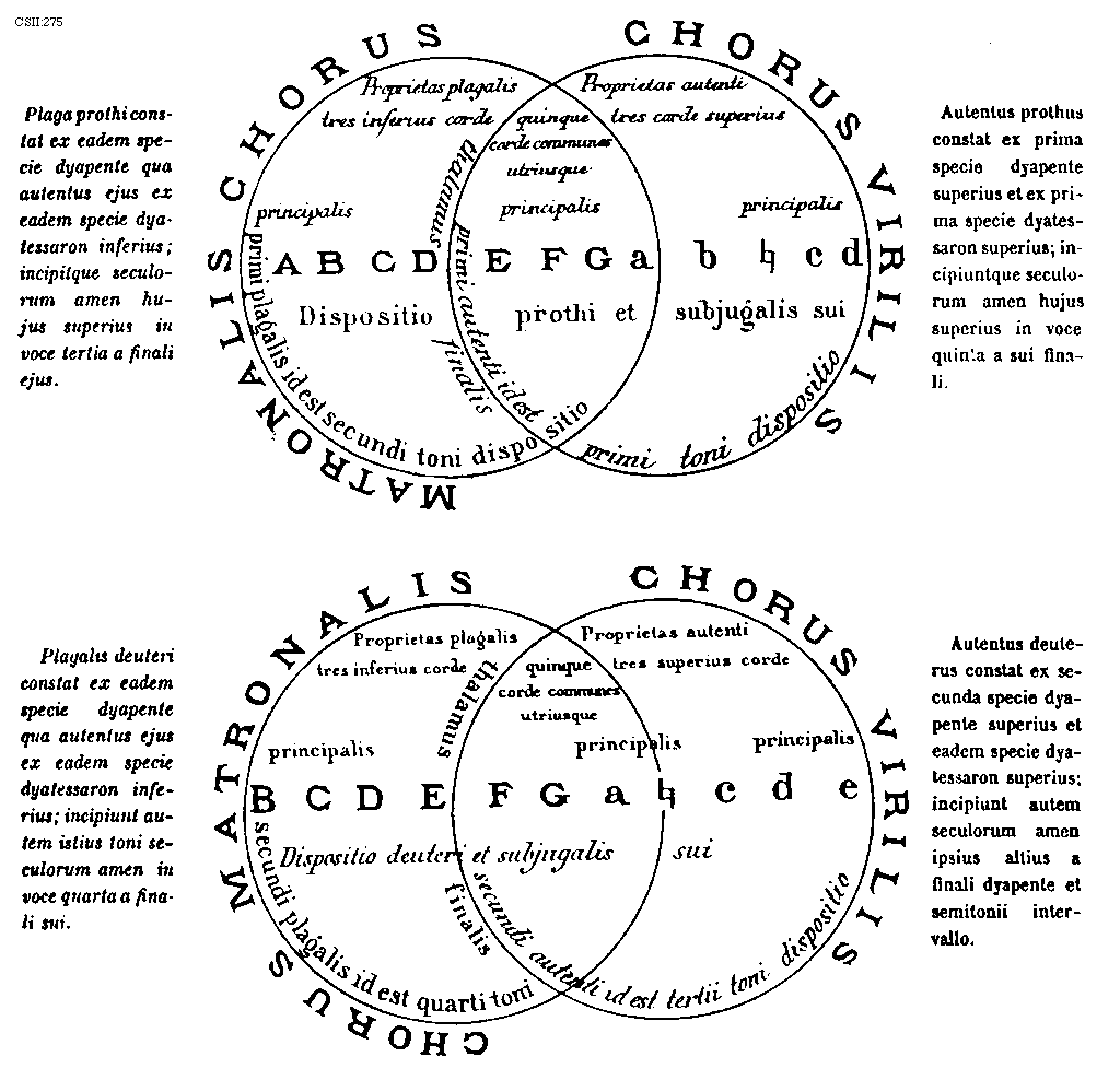 [CSII:275; text: Plaga prothi constat ex eadem specie dyapente qua autentus ejus ex eadem specie dyatessaron inferius; incipitque seculorum amen hujus superius in voce tertia a finali ejus. MATRONALIS CHORUS, CHORUS VIRILIS, Proprietas plagalis tres inferius corde, Proprietas autenti tres corde superius, quinque corde communes utriusque, principalis, Dispositio prothi et subjugalis sui, primi plagalis id est secundi toni dispositio, thalamus finalis, primi autenti id est primi toni dispositio, Authentus prothus constat ex prima specie dyapente superius et ex prima specie dyatessaron superius; incipiuntque seculorum amen hujus superius in voce quinta a sui finali. Plagalis deuteri constat ex eadem specie dyapente qua autentus ejus ex eadem specie dyatessaron inferius; incipiunt autem istius toni seculorum amen in voce quarta a finali sui. CHORUS MATRONALIS, CHORUS VIRILIS, Proprietas plagalis tres inferius corde, Proprietas autenti tres superius corde, quinque corde communes utriusque, principalis, Dispositio deuteri et subjugalis sui, secundi plagalis id est quarti toni, secundi autenti id est tertii toni dispositio, thalamus finalis, Autentus deuterus constat ex secunda specie dyapente superius et eadem specie dyatessaron superius; incipiunt autem seculorum amen ipsius altius a finali dyapente et semitonii intervallo. A, B, C, D, E, F, G, a, b, [sqb], c, d, e] [JACSM6A 24GF]