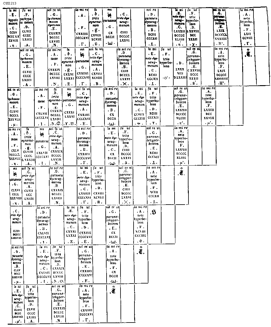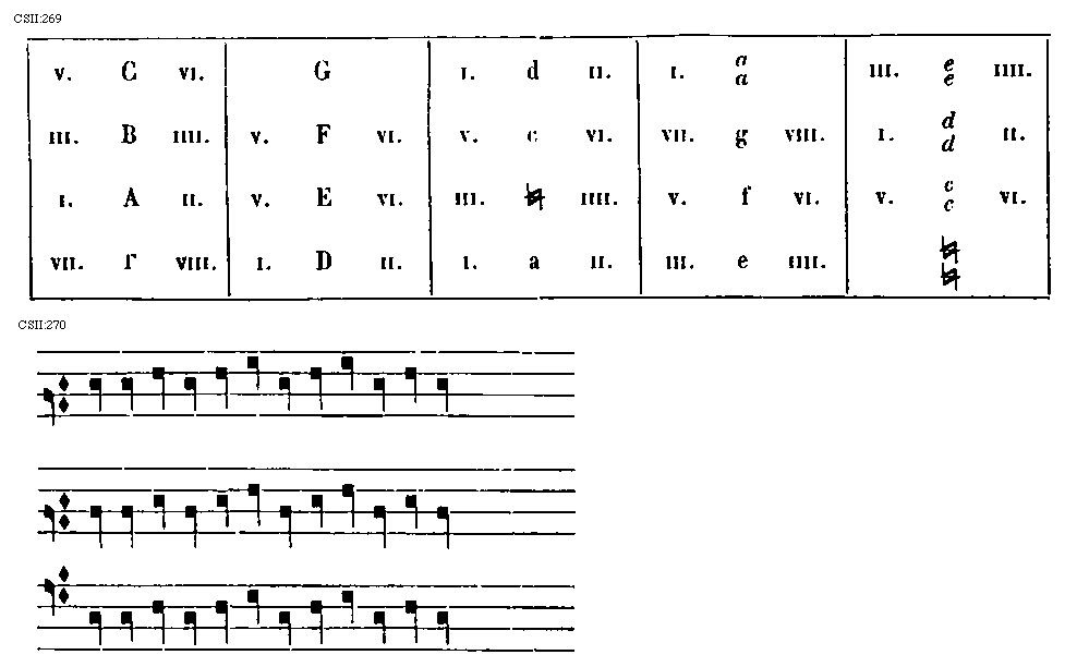 [CSII:269; text: I. II. III. IIII. V. VI. VII. VIII. [Gamma], A, B, C, D, E, F, G, a, [sqb], c, d, e, f, g, aa, [sqb][sqb], cc, dd, ee] [JACSM6A 21GF]