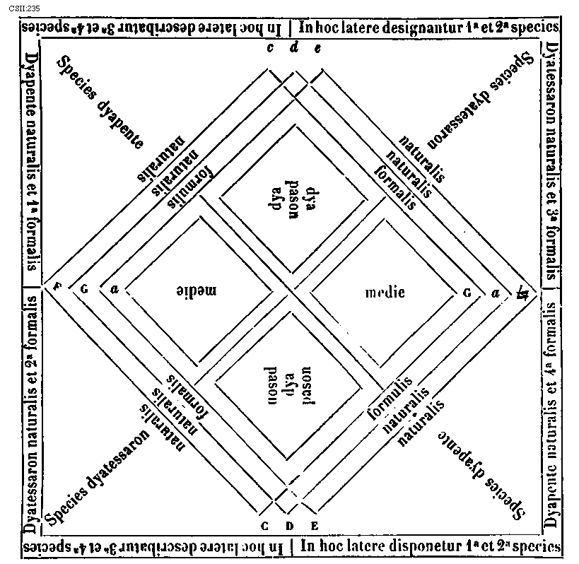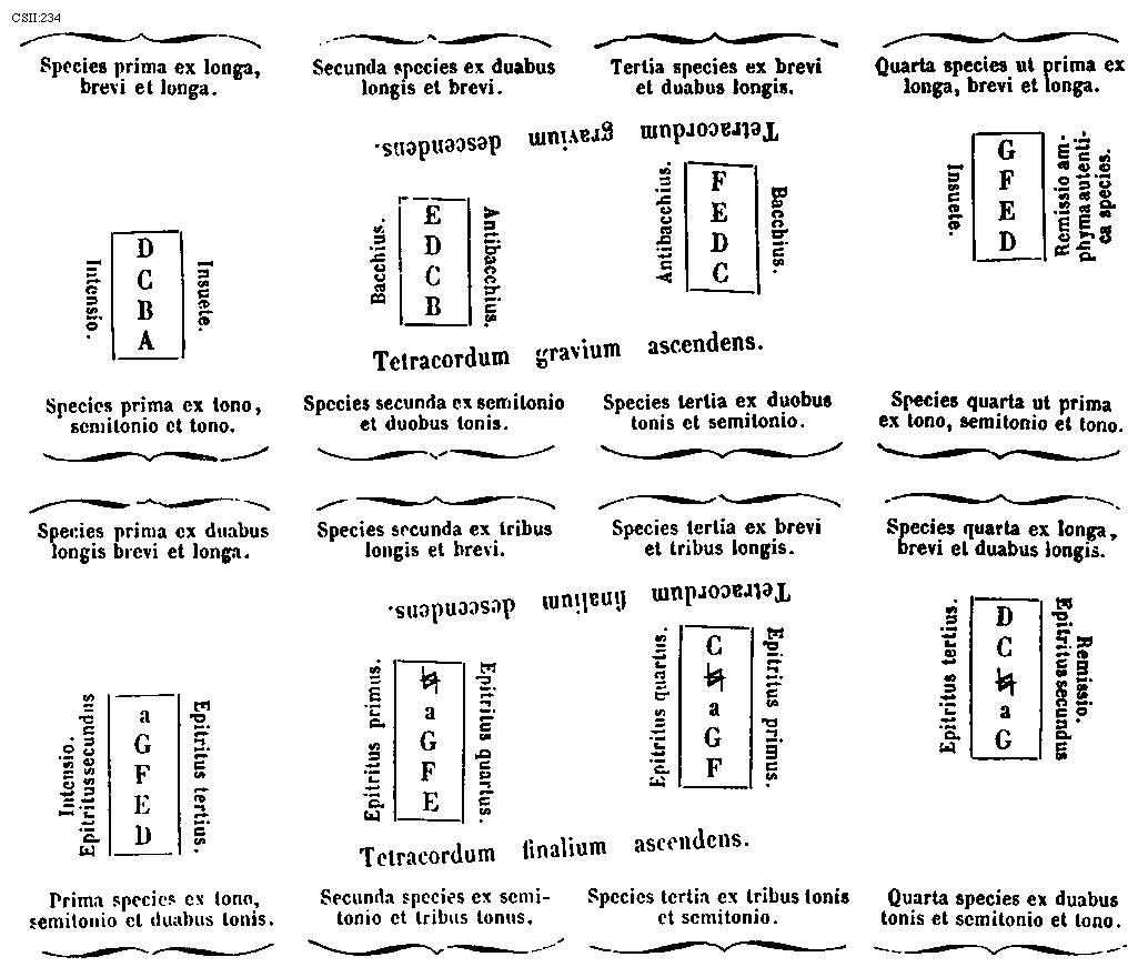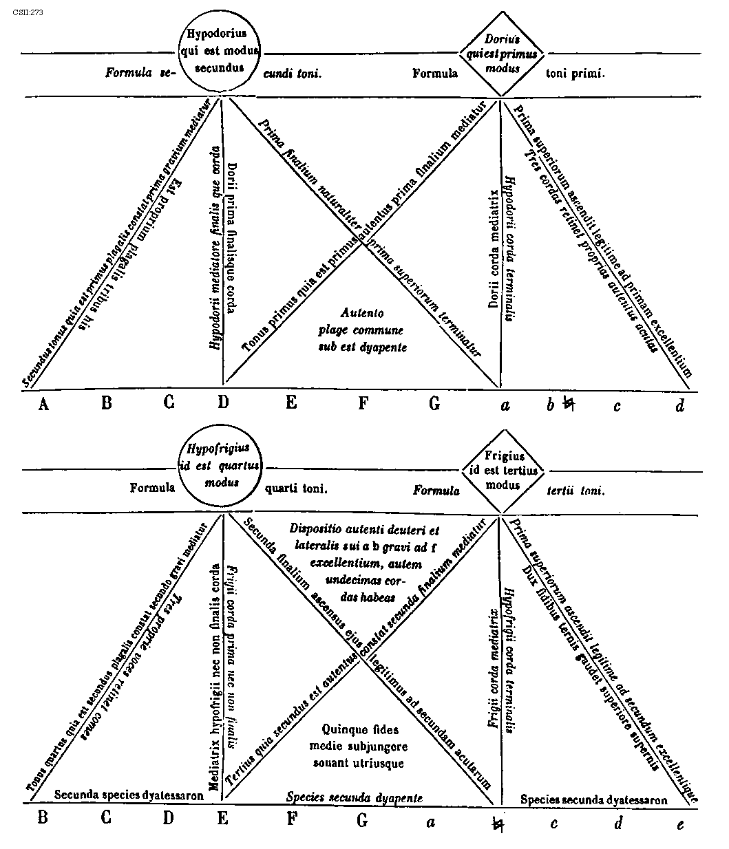 [CSII:273; text: Formula secundi toni. Hypodorius qui est modus secundus, Secundus tonus quia est primus plagalis constat prima gravium mediatur, Est proprium plagalis tribus his, Hypodorii mediatore finalis que corda, Dorii prima finalisque corda, Prima finalium naturaliter prima superiorum terminatur, Formula toni primi. Dorius qui est primus modus, Tonus primus quia est primus autentus prima finalium mediatur, Prima superiorum ascendit legitime ad primam excellentium, Tres cordas retinet proprias autentus acutas, Dorii corda mediatrix, Hypodorii corda terminalis, Autento plage commune sub est dyapente, Formula quarti toni. Hypofrigius id est quartus modus, Tonus quartus quia est secundus plagalis constat secundo gravi mediatur, Tres proprie voces retinet comes, Mediatrix hypofrigii nec non finalis corda, Frigii corda prima nec non finalis, Secunda finalium ascensus ejus legitimus ad secundam acutarum, Formula tertii toni. Tertius quia secundus est authentus constat secunda finalium mediatur, Frigius id est tertius modus, Frigii corda mediatrix, Hypofrigii corda terminalis, Prima superiorum ascendit legitime ad secundum excellentique, Dux fidibus ternis gaudet superiore supernis, Dispositio autenti deuteri et lateralis sui a b gravi ad f excellentium, autem undecimas cordas habeas, Quinque fides medie subjungere sonant utriusque, Secunda species dyatessaron, Species secunda dyapente, Species secunda dyatessaron, A, B, C, D, E, F, G, a, b, [sqb], c, d, e] [JACSM6A 22GF]