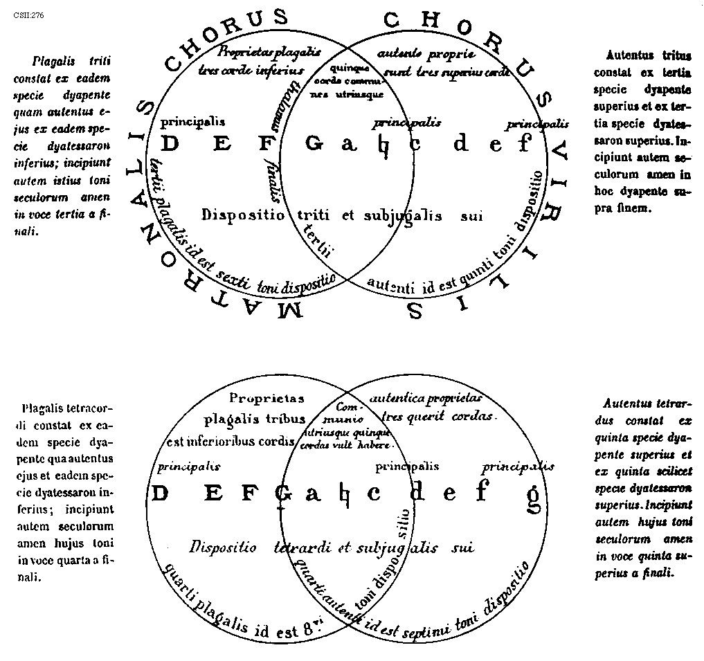 [276] [CSII:276; text: Plagalis triti constat ex eadem specie dyapente quam autentus ejus ex eadem specie dyatessaron inferius; incipiunt autem istius toni seculorum amen in voce tertia a finali. MATRONALIS CHORUS, CHORUS VIRILIS, Proprietas plagalis tres corde inferius, autente proprie sunt tres superius corde, quinque corde communes utriusque, principalis, thalamus finalis, tertii plagalis id est sexti toni dispositio, tertii autenti id est quinti toni dispositio, Dispositio triti et subjugalis sui, Autentus tritus constat ex tertia specie dyapente superius et ex tertia specie dyatessaron superius. Incipiunt autem seculorum amen in hoc dyapente supra finem. Plagalis tetracordi constat ex eadem specie dyapente qua autentus ejus et eadem specie dyatessaron inferius; incipiunt autem seculorum amen hujus toni in voce quarta a finali. Proprietas plagalis tribus est inferioribus cordis, autentica proprietas tres querit cordas. Communio utriusque quinque cordas vult habere. principalis, Dispositio tetrardi et subjugalis sui, quarti plagalis id est 8vi. toni dispositio, quarti autenti id est septimi toni dispositio, Autentus tetrardus constat ex quinta specie dyapente superius et ex quinta scilicet specie dyatessaron superius. Incipiunt autem hujus toni seculorum amen in voce quinta superius a finali. D, E, F, G, a, [sqb], c, d, e, f, g] [JACSM6A 25GF]