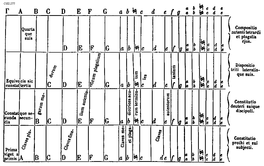 [CSII:277; text: [Gamma], A, B, C, D, E, F, G, a, b, [sqb], c, d, e, f, g, aa, bb, [sqb][sqb], cc, dd, ee, Quarta que suis, Compositio autenti tetrardi et plagalis ejus. Equivocis sic constat tertia, Dispositio triti lateralisque suis. Constat que secunda secundis, Constitutio deuteri suique discipuli. Prima viget a primis, Constitutio prothi et sui subjecti. Claves plagarum modorum, Claves finalium autentorum plagalium, Claves mediotrices acutum et plagarum terminales, Claves autentorum tantum] [JACSM6A 26GF]