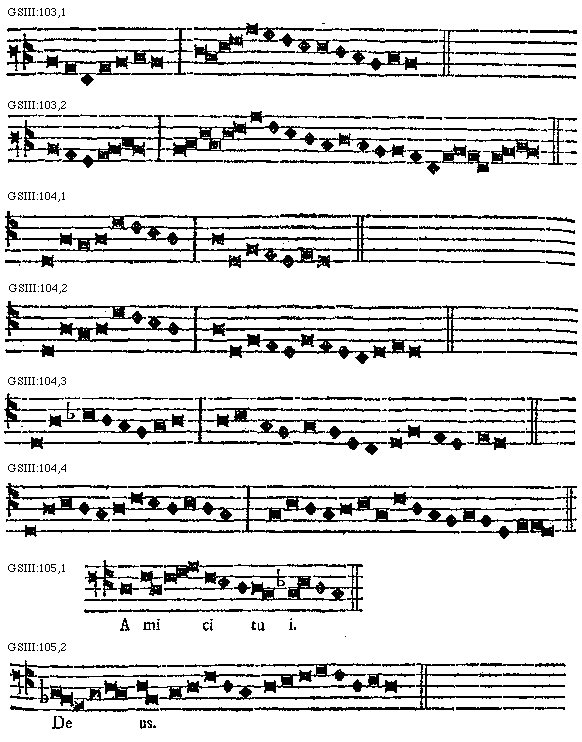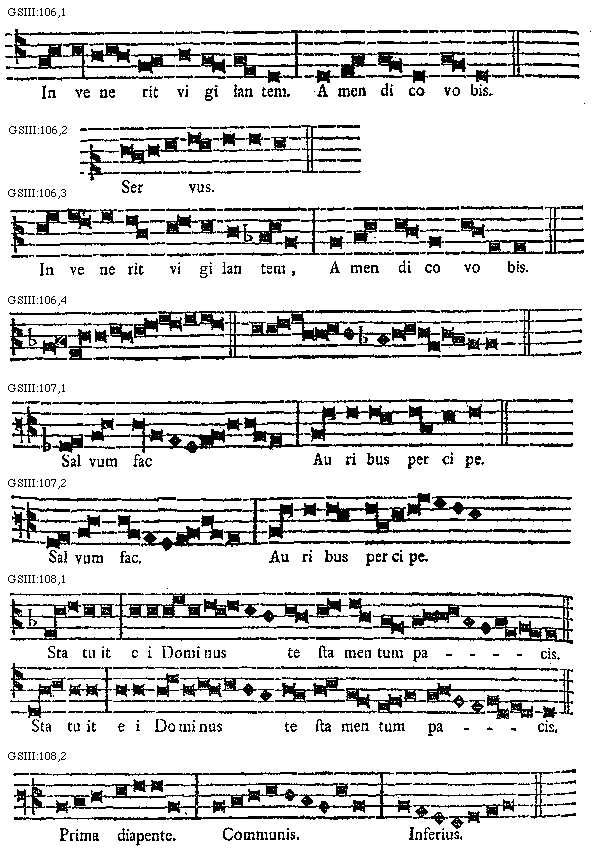 Et hoc idem dicimus de quolibet tono, scilicet quod propter aliquod accidens vel plura, terminare (debet) in confinali, si in finali sua non potest proprie collocari. Sunt namque nonnulli cantus, qui neque in finali neque in [106] confinali finiri possunt propter aliqua inconvenientia accidentia in ipsis cadentia, ut est communio: Beatus servus, et similes. Nam si in finali propria terminatur, tunc oportet, quod fiat semiditonus descendendo ab a. acuto ad F. grave in eo loco, ubi dicitur invenerit a syllaba ve ad syllabam rit. Praeterea illae species diatessaron, quae sunt ab invenerit usque ad dico vobis, sunt in figura primae speciei diatessaron, et earum prolatio sonat tertiam speciem diatessaron. Nam in omni loco, ubi descendimus de G. gravi in F. grave, naturaliter coinclinamus ad semitonium proferendum, ut hic de ambobus accidentibus praedictis possumus probabiliter experiri.
