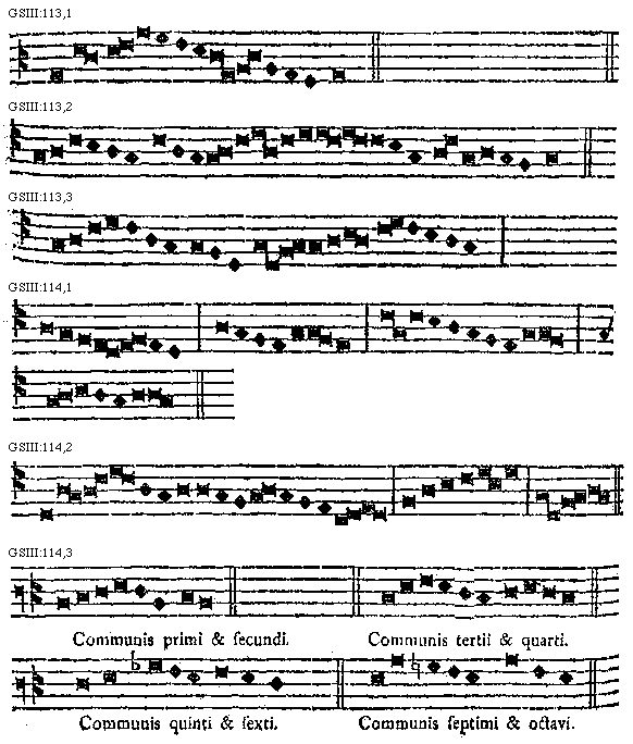 Incipitur primus tonus in C. gravi, ut est introitus Gaudeamus omnes in Domino: [108] in D. gravi, ut introitus Statuit ei Dominus: Sed potest aliquis dicere: quare non possumus incipere hunc introitum Statuit in G. gravi; nam ibi per dispositionem b rotundi inveniuntur omnes species diatessaron et diapente, quae eidem competunt, sicut si in D. gravi incipiatur, ut in praesentibus patet exemplis: