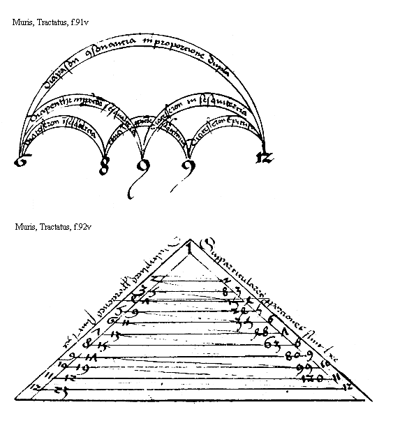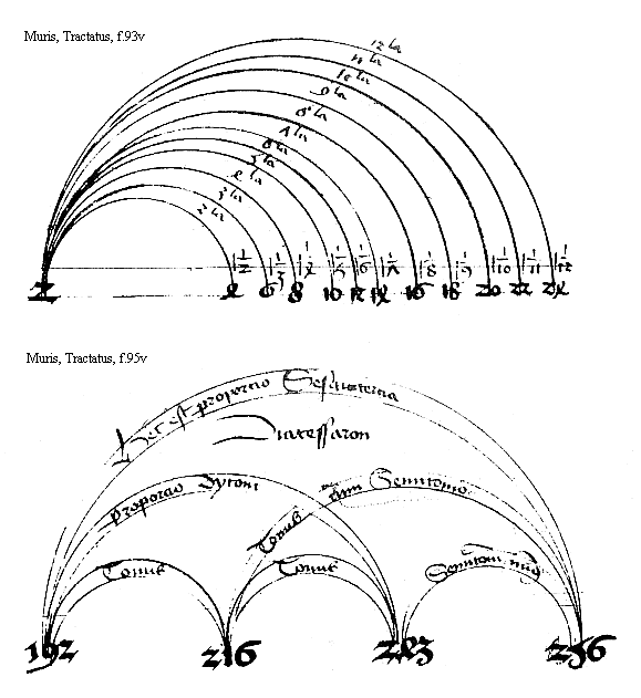 [Muris, Tractatus, f.91v; text: diapason consonancia in proporcione dupla, diapenthe in proporcione sesqualtera, diatesseron in sesquitercia, tonus in proporcione sesquioctaua, diatesseron epitriti, 6, 8, 9, 12] [MURMSPEC 01GF]