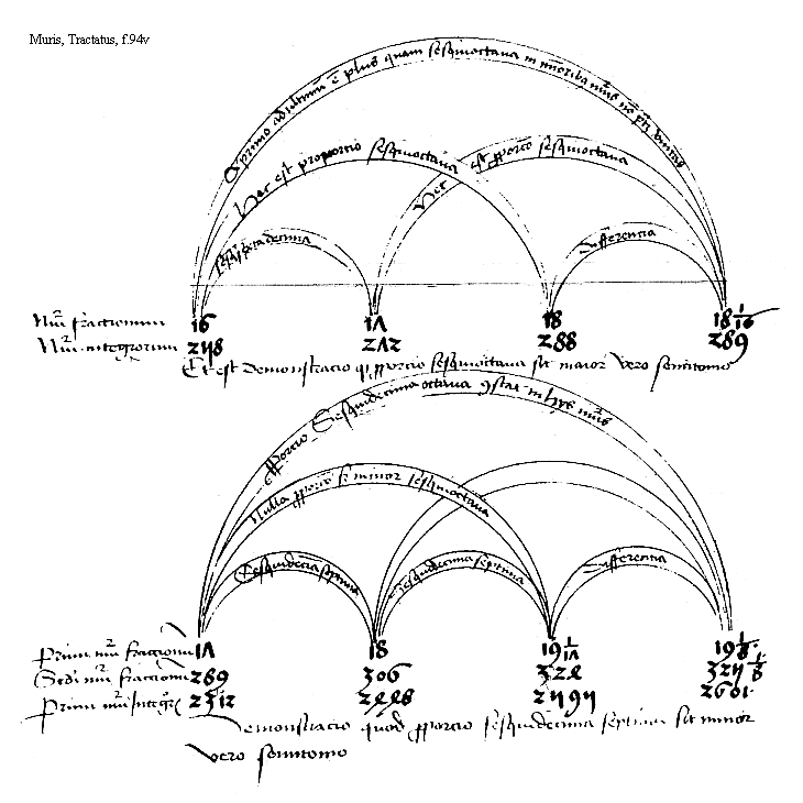 [Muris, Tractatus, f.94v; text: Numerum fractionum, Numerum integrorum, Et est demonstracio quod proporcio sesquioctaua sit maior vero semitonio, A primo ad ultimum est plus quam sesquioctaua in minoribus numeris non patet vnitas, Hec est proporcio sesquioctaua, sesquisextadecima, differencia, 16, 17, 18, 18 1/16, 258, 272, 288, 289, Primum numerum fraccionum, Secundum numerum fraccionum, Primum numerum integrorum, Demonstracio quod proporcio sesquidecima septima sit minor vero semitonio, Proporcio sesquidecima octaua constat in hijs numeris, Nulla proporcio sed minor sesquioctaua, Sesquidecimaseptima, differencia, 17, 18, 19 1/17, 19 1/8, 289, 306, 324, 325 1/8, 2312, 2448, 2595, 2601] [MURMSPEC 03GF]
